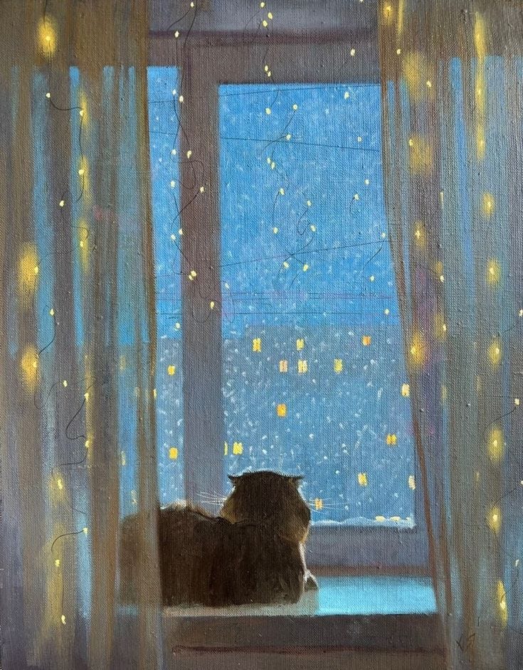 You’re sitting across from me as I write this. It’s snowing outside—not the first snow of the year, but the first that will stick around. The moonlight just barely peeks through my third-floor window, diffused and broken by the arms of that giant oak tree. The first time you came over was in August, when she still held all her leaves. It’s December now, and she has shed her skin.